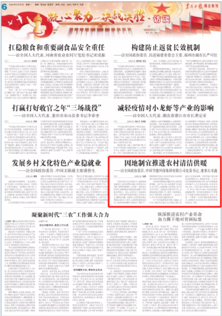 农民日报 因地制宜推进农村清洁供暖——访全国政协委员,中国节能环保集团有限公司党委书记、董事长宋鑫