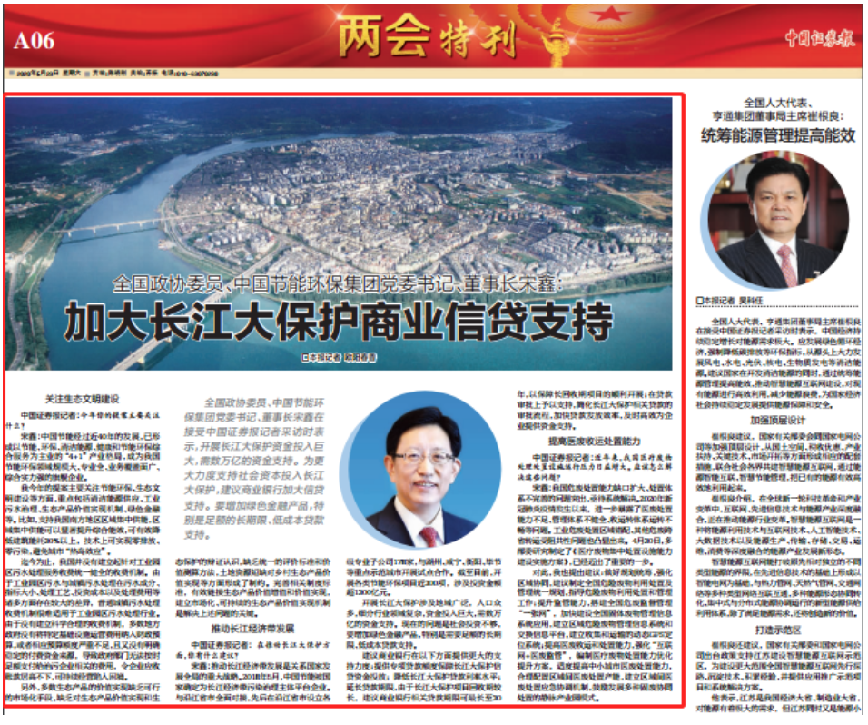28.中国证券报:全国政协委员、中国节能环保集团党委书记、董事长宋鑫:加大长江大保护商业信贷支持